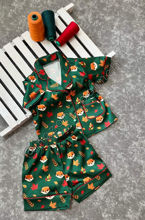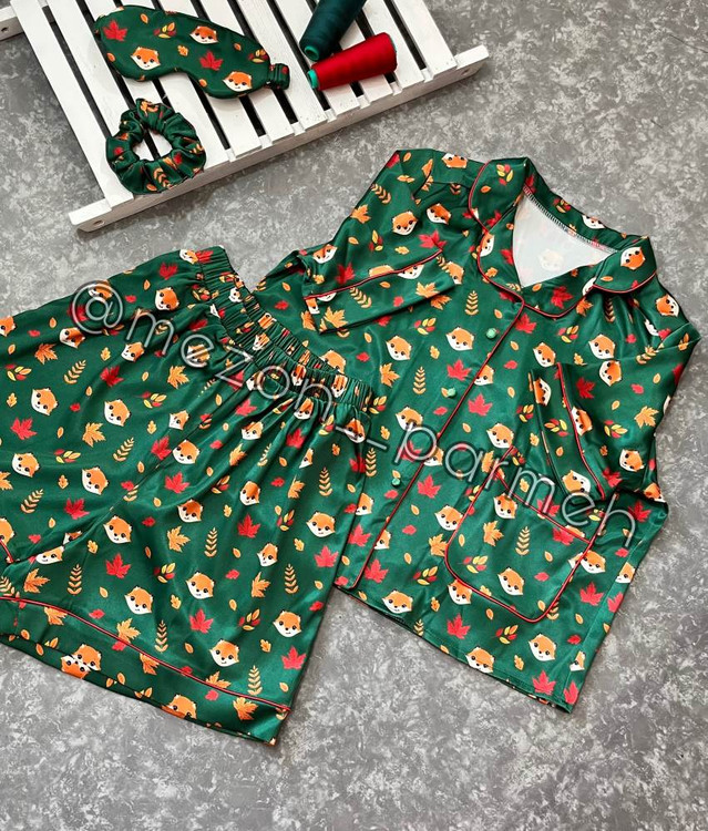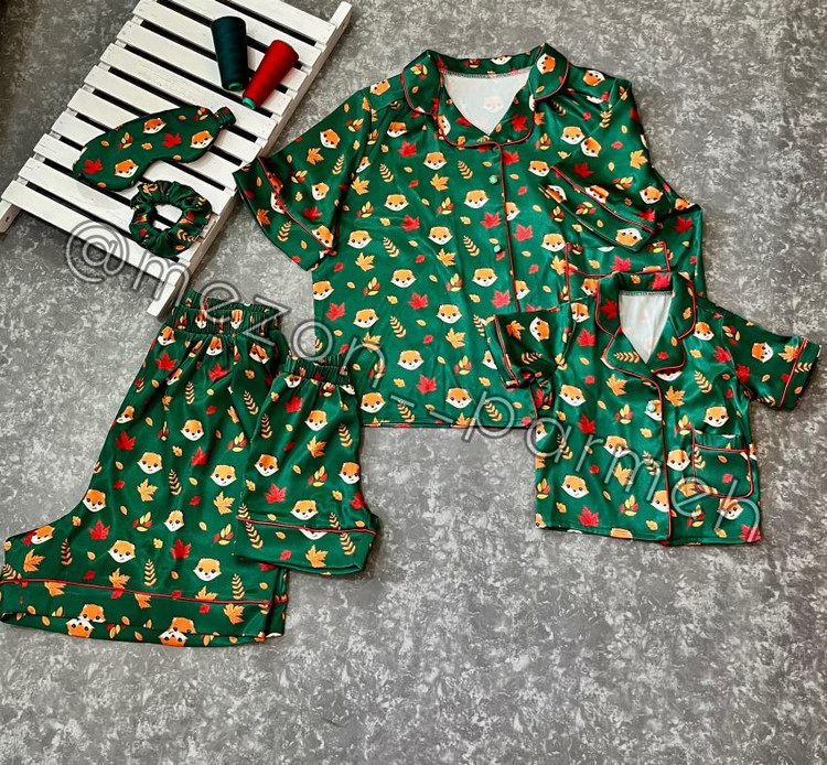 ست لباس خواب مادر وفرزندیبسیار شاد و فانتزی که از جنس ساتن براق و لطیف دوخته شده است. رنگ زمینه لباسها سبز زمردی بوده و روی آن طرحهای بامزه صورت روباههای کوچک به همراه برگهای رنگارنگ پاییزی چاپ شده که ظاهری دلنشین و خاص ایجاد کرده است.
