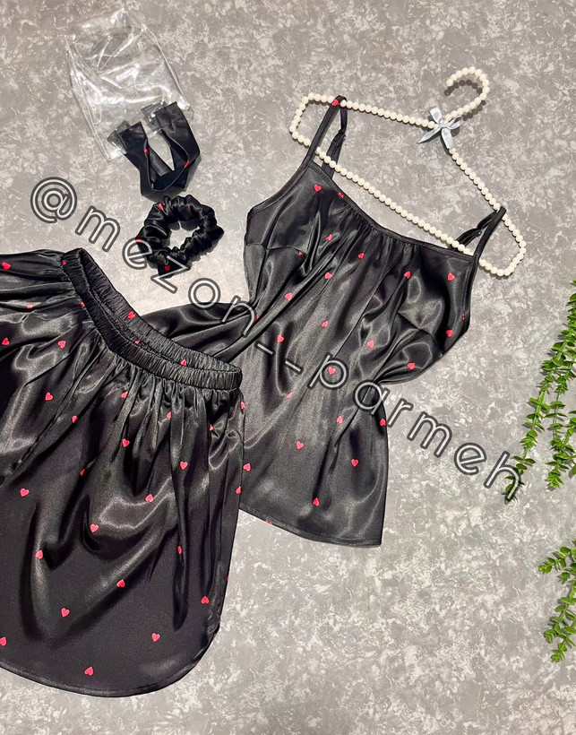 ست لباس خواب زنانه ساتن مشکی طرح قلب قرمز | تاپ بندی و شلوارک + اسکرانچی و بگ طلقی