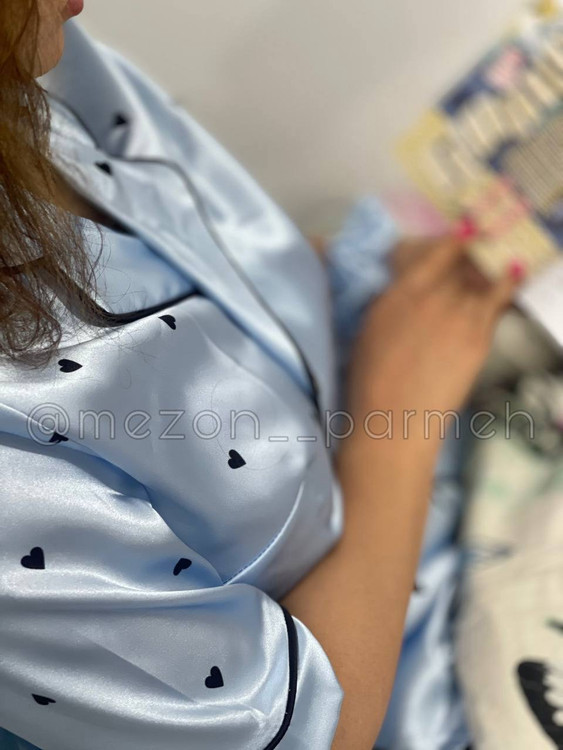 🌟 طراحی این لباس با طرح قلبهای ریز مشکی روی زمینه آبی آسمانی بسیار خاص و دخترونهست. جنس ساتن نرم و خنک هست و برای فصل تابستون یا استفاده در خونه خیلی راحته.