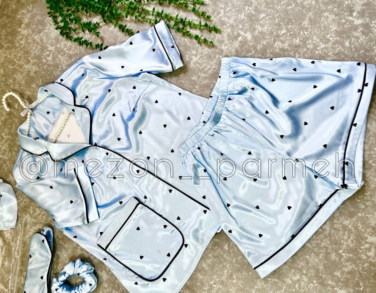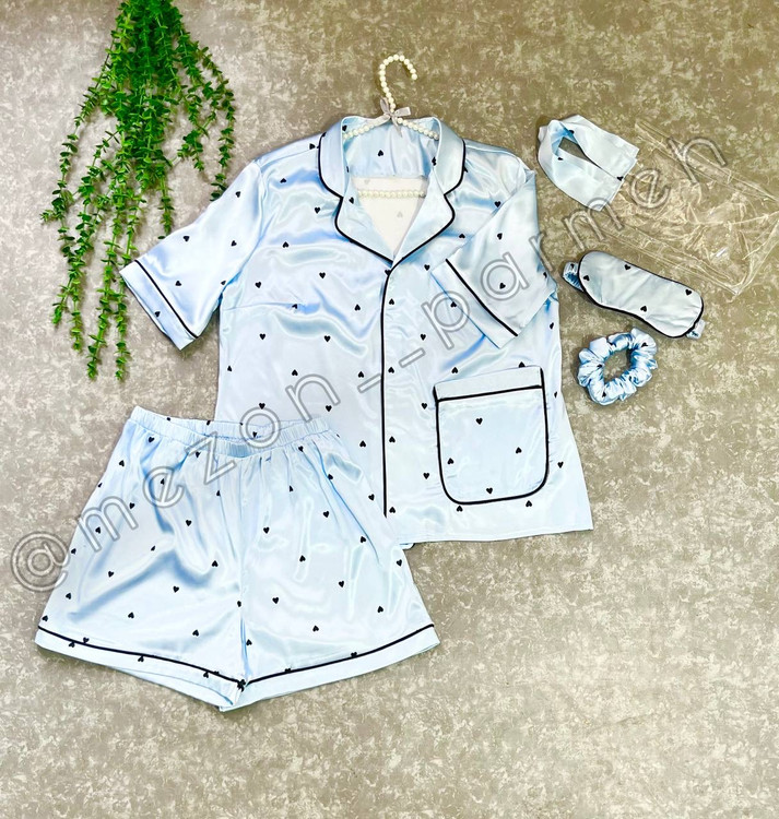 ست لباس خواب زنانه ساتن آبی طرح قلب مشکی | پیراهن و شورتک + چشمبند و کش مو