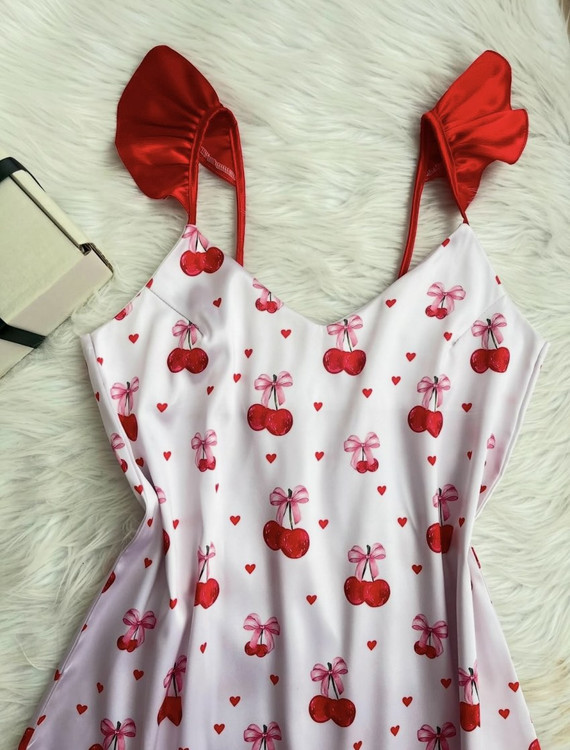 با این پیراهن خواب فانتزی و شیک، شبی آرام و رویایی را تجربه کنید. این لباس خواب تکتکه از پارچهای نرم و لطیف تهیه شده و با طراحی دلبرانه گیلاسهای قرمز و قلبهای کوچک، حس طراوت و انرژی مثبت را القا میکند. بندهای پیراهن به رنگ قرمز و با جزئیات چیندار در قسمت شانه، به این مدل ظاهری خاص و دخترانه دادهاند.