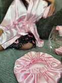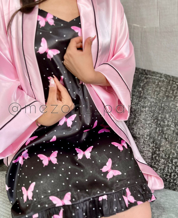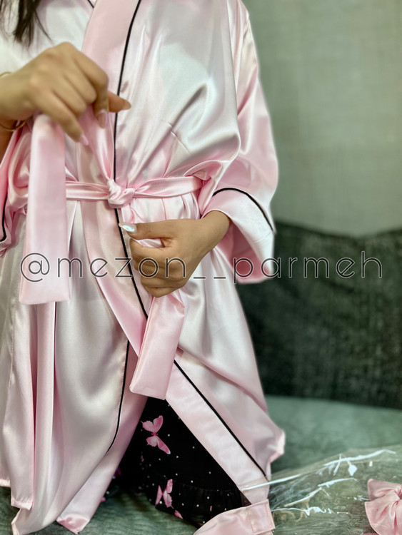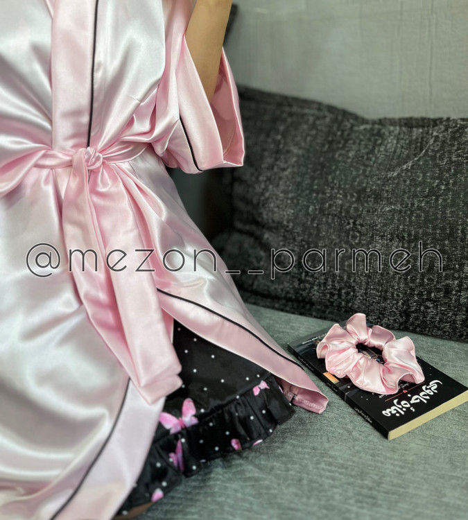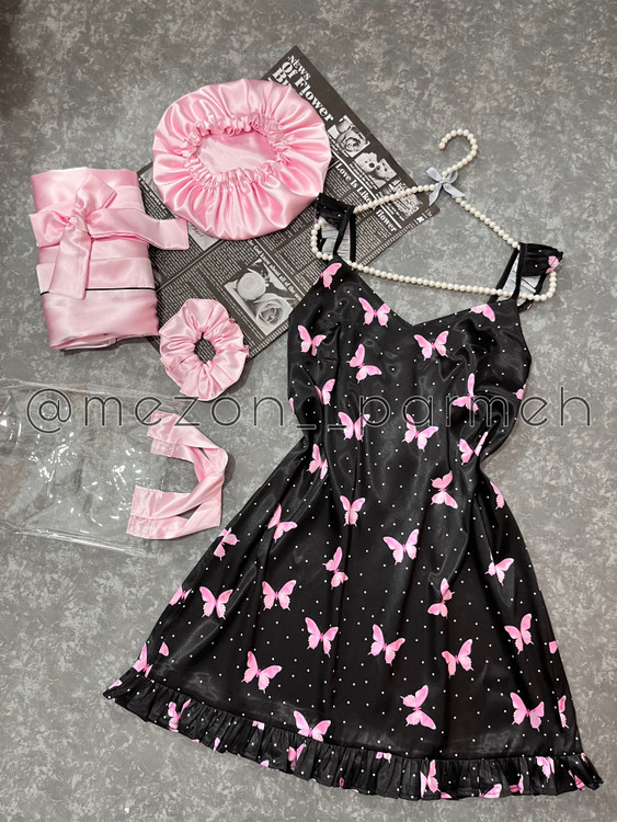 با این ست زیبا و شیک از جنس ساتن، راحتی و جذابیت را همزمان تجربه کنید! این ست شامل یک روبدوشامبر ساتن به رنگ صورتی براق با کمربند، به همراه یک لباس خواب مشکی با طرح پروانه صورتی است. همچنین یک چشمبند و یک اسکرانچی(کش مو) و کلاه ساتن ست با آن، این مجموعه را کامل میکند. این ست گزینهای ایدهآل برای استایل خانگی شیک و یا هدیهای خاص برای عزیزانتان است