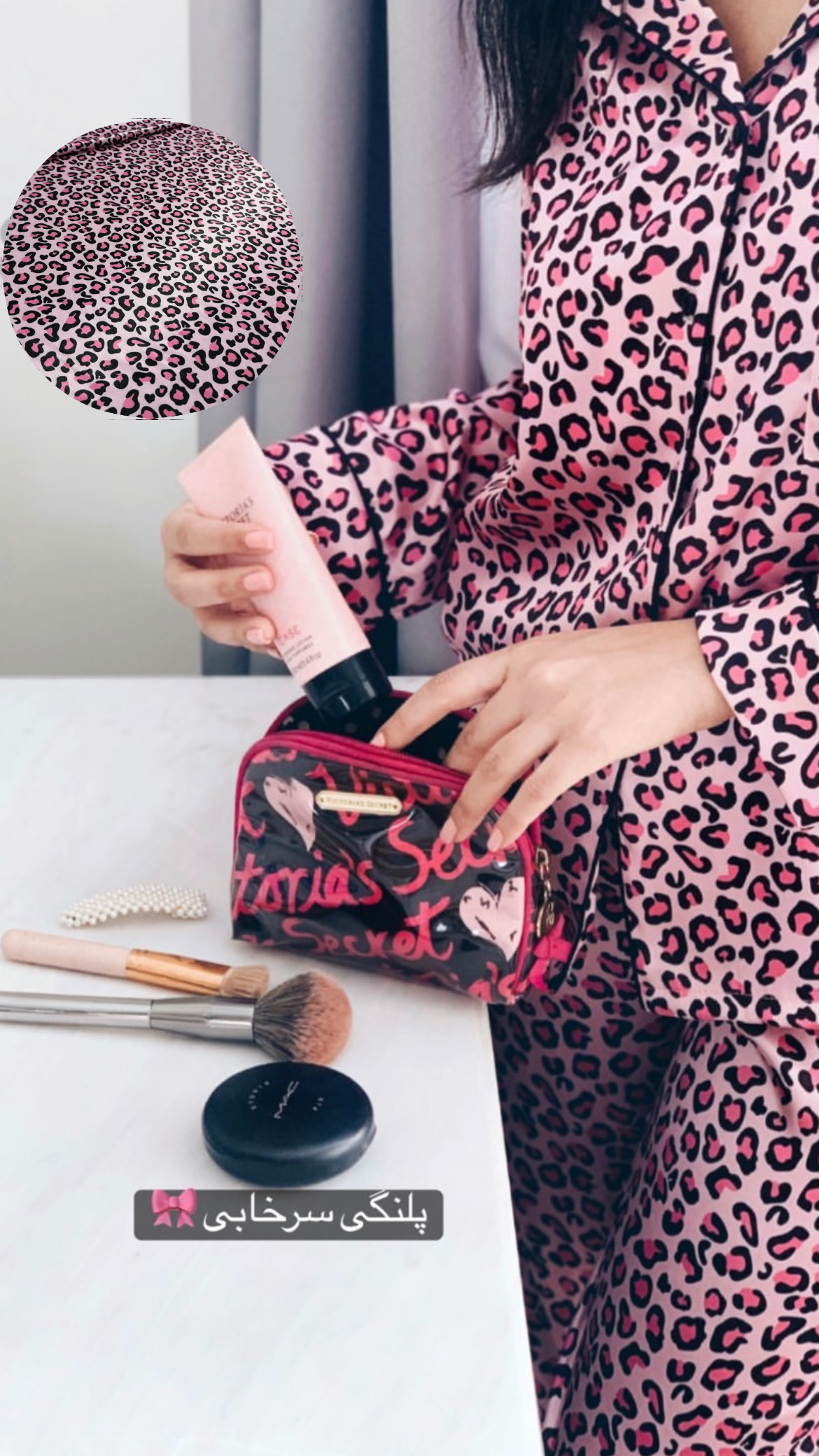 خرید ست بلوز و شلوار خواب زنانه پلنگی سرخابی و مشکی شامل:(بلوز و شلوار به همرا اسکرانچی و بگ طلقی رایگان)