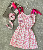 پیراهن بنددار ساتن Lx طرح پلنگی سفید صورتی پرمه