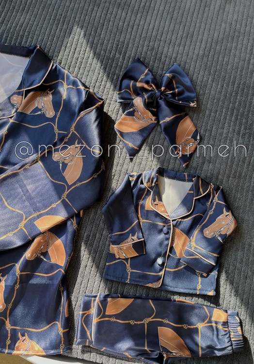 ست لباس خواب مادر وفرزندی بسیار شاد و فانتزی که از جنس ساتن براق و لطیف دوخته شده است. رنگ زمینه لباسها سرمه اس میباشد(طرح اسب)
