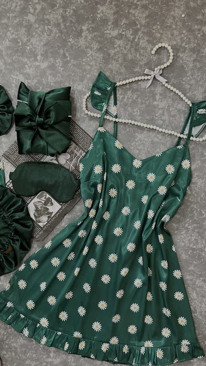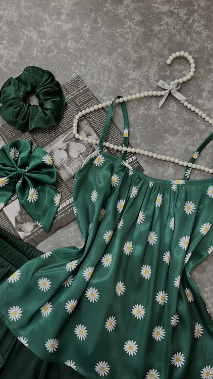 با این ست زیبا و شیک از جنس ساتن، راحتی و جذابیت را همزمان تجربه کنید! این ست شامل یک روبدوشامبر ساتن سبز زمردی براق با کمربند، به همراه یک لباس خواب بابونه زمینه سبز است. همچنین یک چشمبند و یک اسکرانچی(کش مو) و کلاه ساتن ست با آن، این مجموعه را کامل میکند. این ست گزینهای ایدهآل برای استایل خانگی شیک و یا هدیهای خاص برای عزیزانتان است