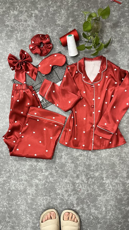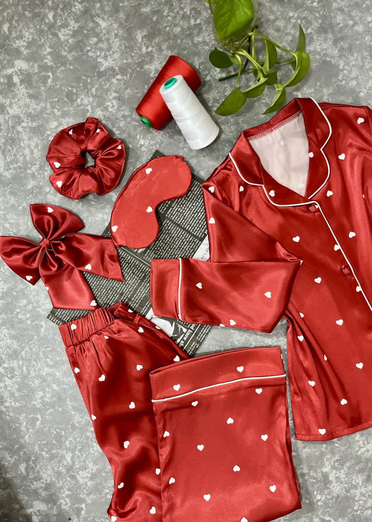 ست لباس خواب مادر وفرزندی بسیار شاد و فانتزی که از جنس ساتن براق و لطیف دوخته شده است. رنگ زمینه لباسها قرمز میباشد(قلب بزرگ سفید)