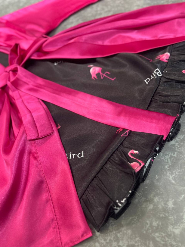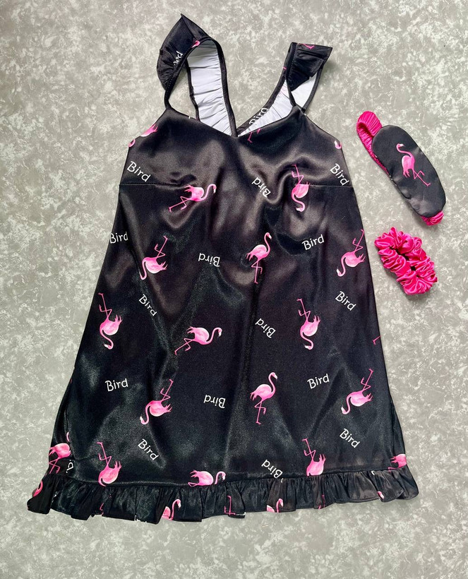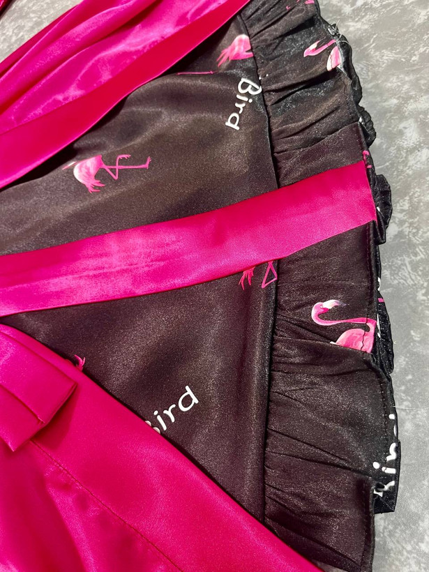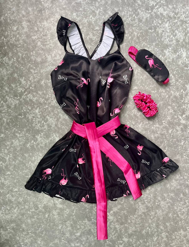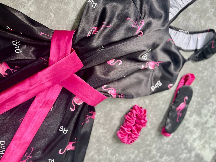 با این ست زیبا و شیک از جنس ساتن، راحتی و جذابیت را همزمان تجربه کنید! این ست شامل یک روبدوشامبر ساتن به رنگ سرخابی براق با کمربند، به همراه یک لباس خواب مشکی با طرح فلامینگو است. همچنین یک چشمبند و یک اسکرانچی (کش مو) ست با آن، این مجموعه را کامل میکند. این ست گزینهای ایدهآل برای استایل خانگی شیک و یا هدیهای خاص برای عزیزانتان است
