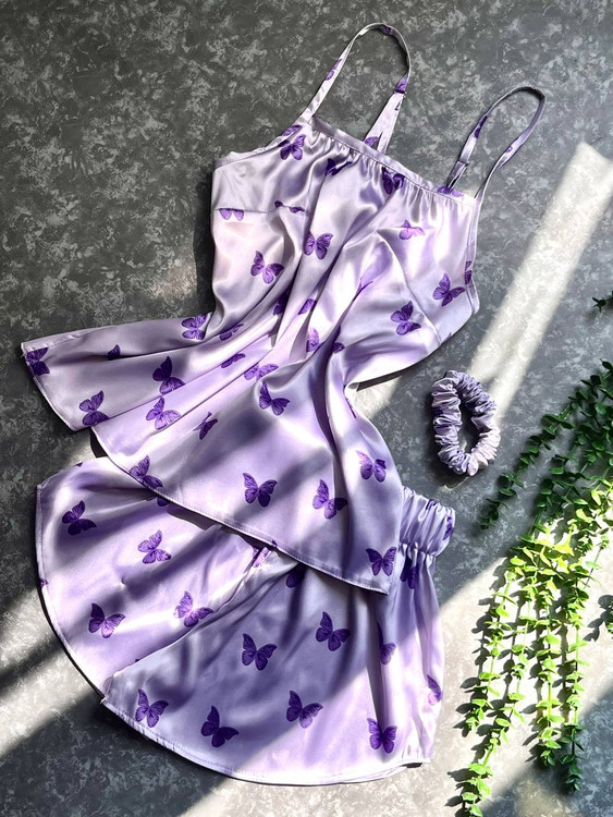 این ست زیبای لباس خواب ساتن به رنگ سبز زمردی با طرح قلبهای کوچک و یاسی با طرح پروانه بنفش ترکیبی از راحتی و استایل را به شما هدیه میدهد. این مجموعه شامل یک تاپ بندی با بندهای قابل تنظیم، یک شلوارک راحت با کمر کشی، یک اسکرانچی هماهنگ و یک کیف شفاف با دستههای ساتنی است. این لباس خواب گزینهای عالی برای استراحت در خانه یا یک شبنشینی دوستانه است!