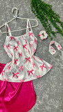 این ست زیبای لباس خواب ساتن پرمه ترکیبی از راحتی و استایل را به شما هدیه میدهد. این مجموعه شامل یک تاپ بندی با بندهای قابل تنظیم، یک شلوارک راحت با کمر کشی، یک اسکرانچی هماهنگ و یک کیف شفاف با دستههای ساتنی است. این لباس خواب گزینهای عالی برای استراحت در خانه یا یک شبنشینی دوستانه است!